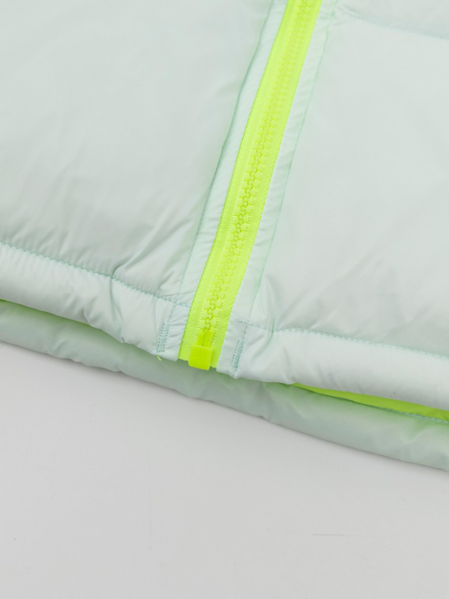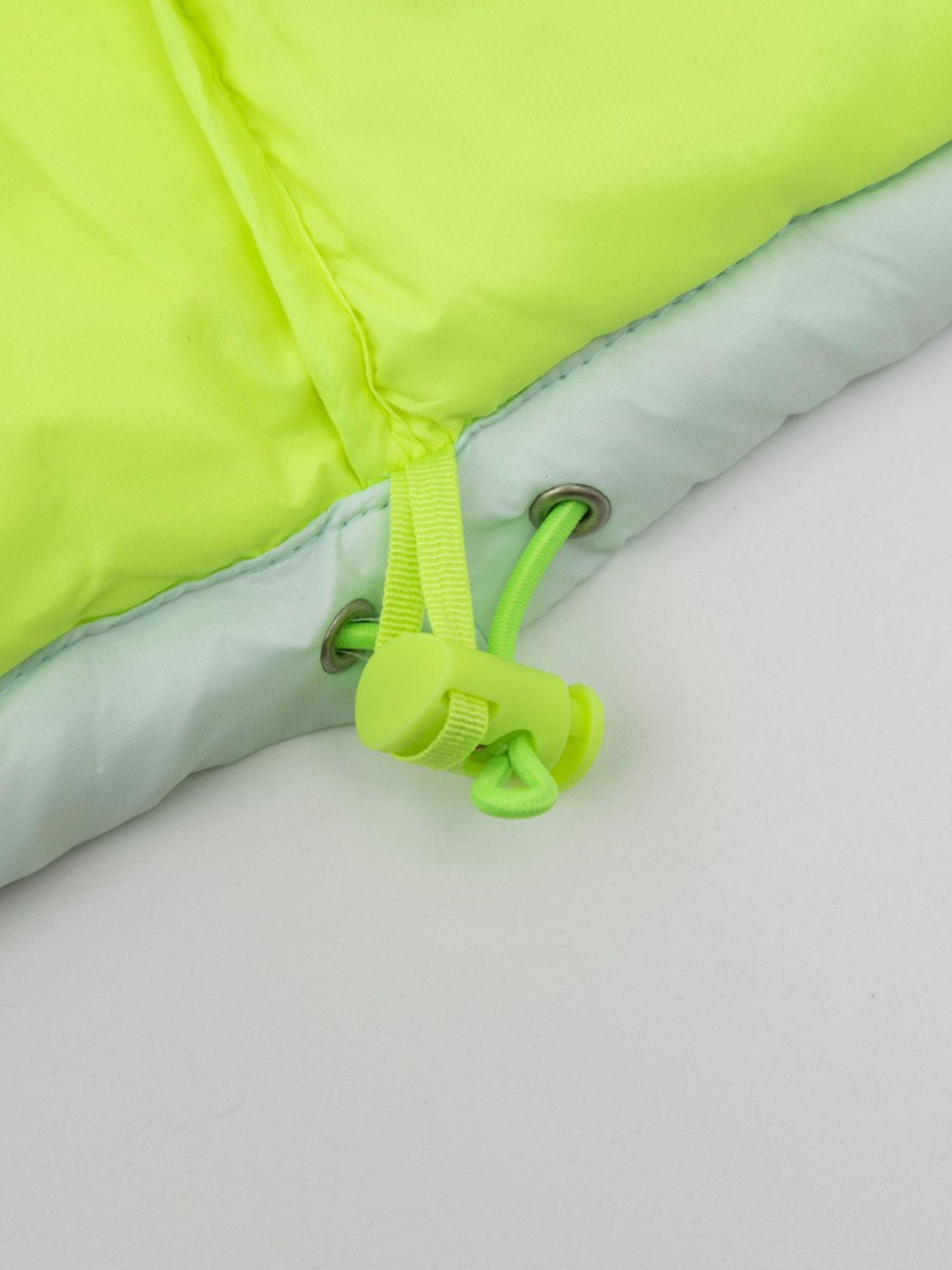 El cuello alto incluye una capucha plegable para adaptarse a distintas condiciones climáticas. Cuando no está en uso, la prenda puede compactarse y guardarse en su propio bolsillo.