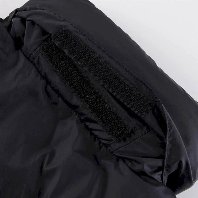 Puños elásticos y cierre frontal: completo con solapa interior para mayor aislamiento.