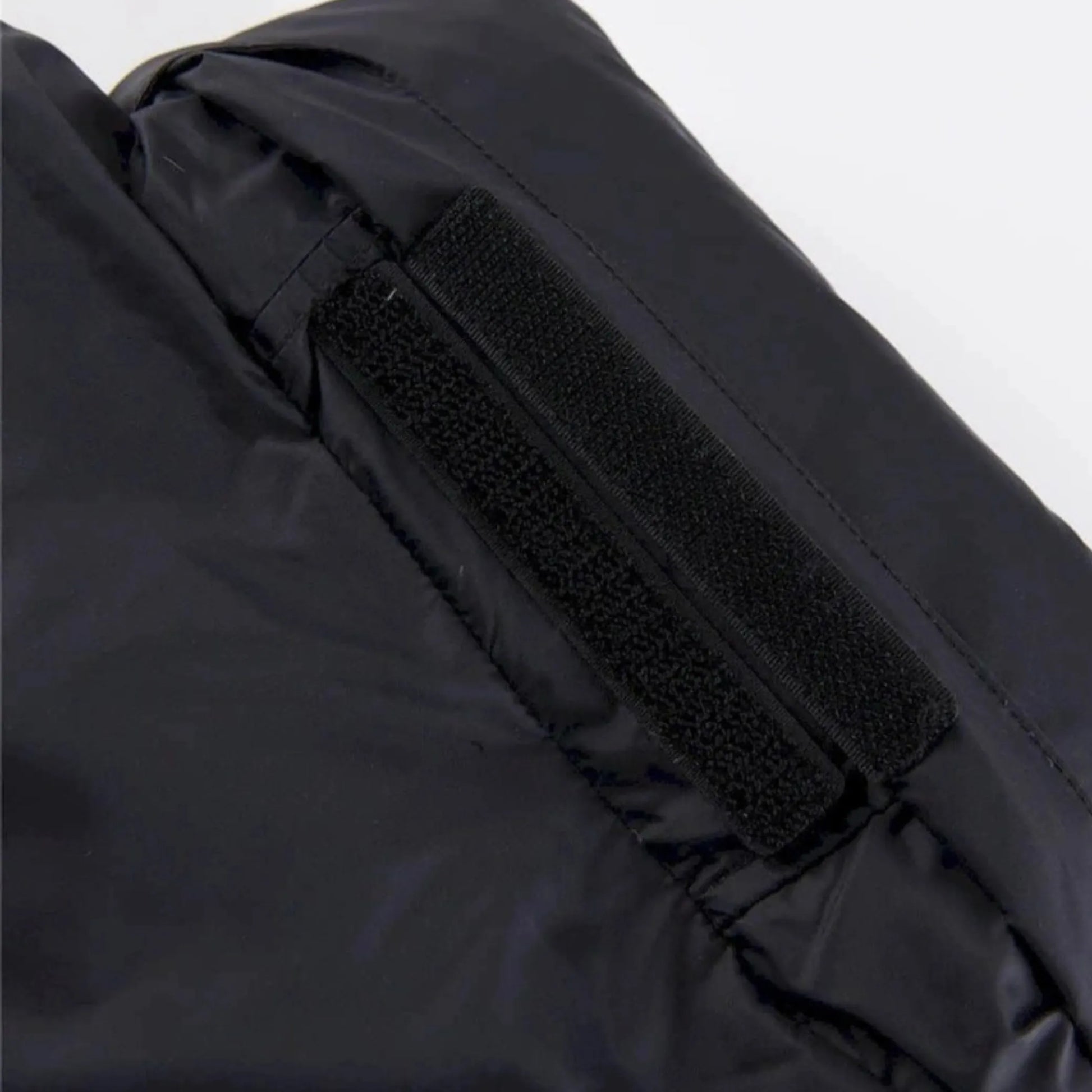 Puños elásticos y cierre frontal: completo con solapa interior para mayor aislamiento.